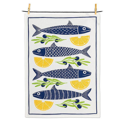Bring some fresh Mediterranean vibes to your kitchen cleaning with this cool Fish & Lemons Tea Towel. Crafted out of cotton, this white tea towel features a colourful Greco-Roman style illustration of fish, lemon and olive sprigs in bold blues, yellows and greens to complement all your cleaning and drying.