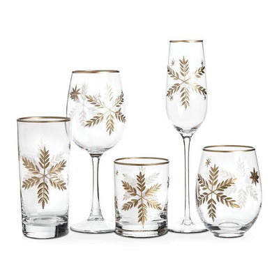 Enhance your festive toasts with the Abbott Gold Snowflake Stem Glasses. This exquisite Snowflake Champagne Flute, made of glass, features a tall stem, a golden rim, and a striking snowflake pattern that adds a touch of elegance to your holiday celebrations and gatherings. A stemmed goblet version is also available.