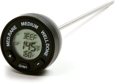 Quick 2-3 second response! Great for grilling or in the kitchen. Registers from 32°F to 392°F / 0°C to 200°C. Easy to use: 7 preprogrammed meat types and a USER mode to set the temperature you desire. Audible alarm. Extra long 8" probe helps keep fingers away from heat. Powered by 2 L1154F button batteries included.