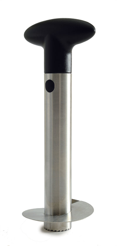 Effortlessly core and slice a whole pineapple. Uniform slices and juices are retained with minimal waste. Comfortable nylon handle with stainless steel body and blade. Works best with 3-4lb pineapples.1. Slice off the leafy crown. 2. Position the cutting disk over the center. 3. Twist the handle with slight downward pressure until the corer is at the bottom of the pineapple. 4. Twist and pull up. 5. Pineapple will be contained on the corer. Unclip the handle to release the spiral of pineapple. 6. Slice down one side to create even slices or dice for fruit salads and garnish.