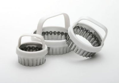This is a must in your kitchen for creating biscuits and cookies! Set of 3 cutters sizes; 1.75 x 4.5cm, 2.25 x 5.5cm, 2.75 x 7cm. Special scalloped edge for fancy design. Stainless steel cutter and plastic easy grip handles. You could even use them to make rolls. Hand washing recommended.