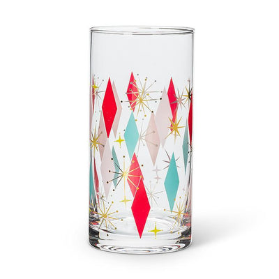You don't have to be a fan of classic art-deco style to be a fan of this retro-chic Pink & Red Diamond Highball Glass. This sturdy highball glass features a delightful pattern of pink, red and baby-blue diamonds accented with golden stars and sparkles – perfect for casual get-togethers, game nights and more. Matching tumber and goblet also available.