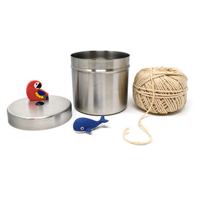 Keep your twine neat, clean, and ready to go with this stylish stainless steel dispenser featuring a built-in cutting blade. Comes with 220 ft of 100% natural, food-safe, unbleached cotton twine (18-ply) and two fun blade covers—a whale and a parrot—for safe storage.