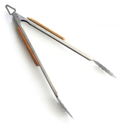 Ideal for grilling, BBQ and serving! Lift, flip and serve foods. Locking tab; pushed down keeps tongs together for easy storage, pull up to open. Long comfortable handle keep hands away from the heat while maintaining control. Stainless steel and durable Acacia wood handles. Hanging loop for easy storage