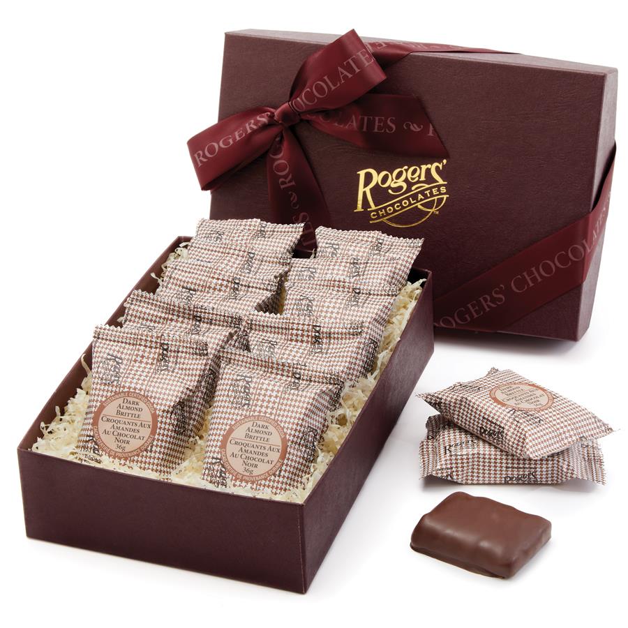 A classic almond brittle made with roasted almonds and homemade buttery candy, finished with your choice of milk or dark chocolate.