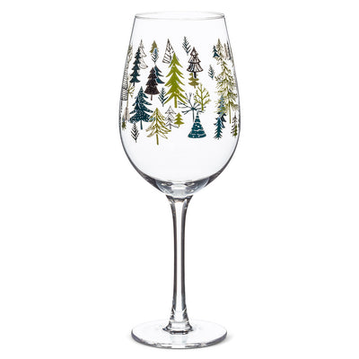 Designed exclusively for Abbott, this stemless glass goblet is accented with graphic-style illustrations of evergreen trees in a variety of different colours, styles and weights