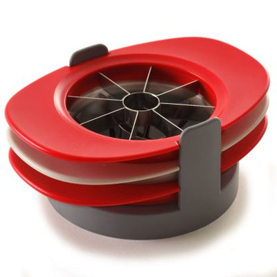 The tomato serrated blade cuts through tomatoes without squashing them. The apple blade neatly cores and creates eight wedges of apples or potatoes. The mango blade slices the mango while simultaneously removing the pit. The push plate elevates the fruit, captures juice for effortless cleaning, and safeguards the blades when stored. It is dishwasher safe and comes packaged.
