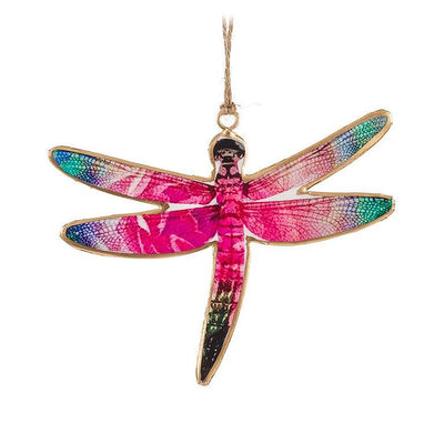 Enhance any object with the vibrant Large Rainbow Dragonfly Ornament, a natural and colorful accent. This ornament, created in India, features a brightly colored dragonfly image shellacked onto a hand-welded metal base, complete with hand-painted golden edges for a striking and unique decorative touch to displays, hanging plants, and more. Additional Metal Imprint Ornaments are available as well.