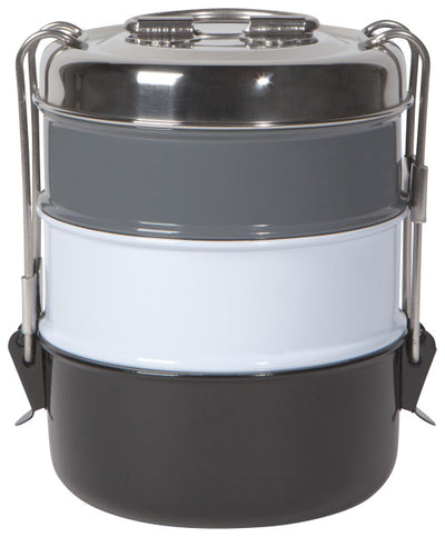 Originally used to pack up a homemade meal for transport through the busy streets of India, the tiffin is made up of stainless steel containers that stack together. A snap closure keeps contents secure while a handle makes carrying convenient.