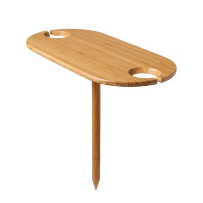 Accommodates two wine Glasses and a plate of goodies. Perfect for a picnic in the park or a day at the beach. Long stick anchors itself into the ground or sandy beach. Table doubles as a cutting board and can disassemble to collapse, making storage and transport easy. All-natural wood construction. This eco-friendly Bamboo Wine Table holds two wine Glasses and still has room for a plate of goodies. Brand: Tovolo