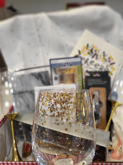 Our Let’s Celebrate Box is the perfect Box for any special occasion, whether it be Christmas, New Year's, an Engagement, Wedding, or Housewarming gift, you name it! This Celebration Box includes gorgeous Abbott Champagne Flutes and Confetti Wine Goblets (available in gold or silver), Fox Run Marble Cheese Slicer and much more!