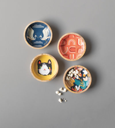 The stunning mango wood these bowls are made from is gathered from trees that are no longer bearing fruit, and would otherwise go to waste. The contrast of bold high-gloss color juxtaposed on the natural wood base creates a beautiful effect, ideal for statement serving pieces.